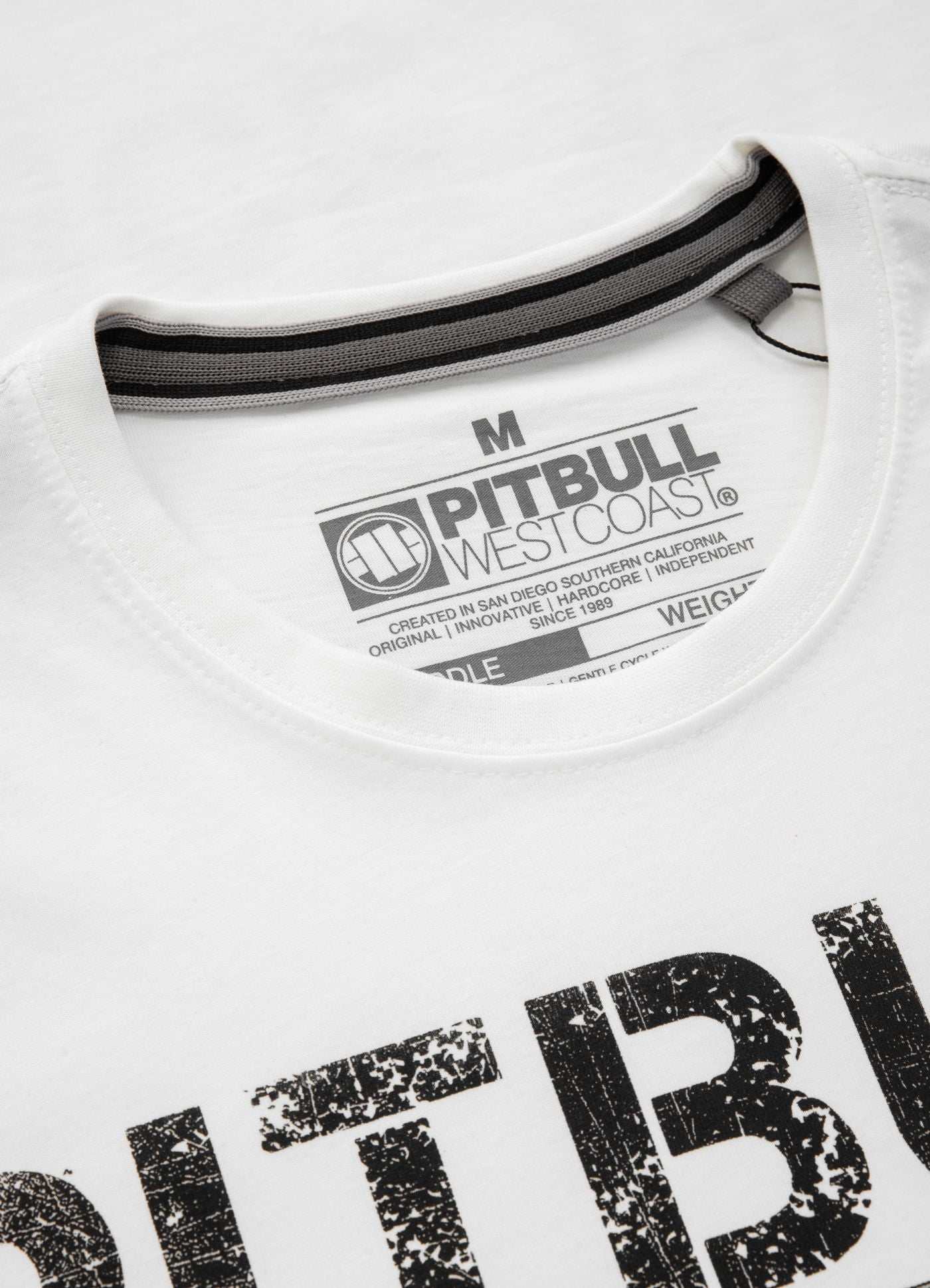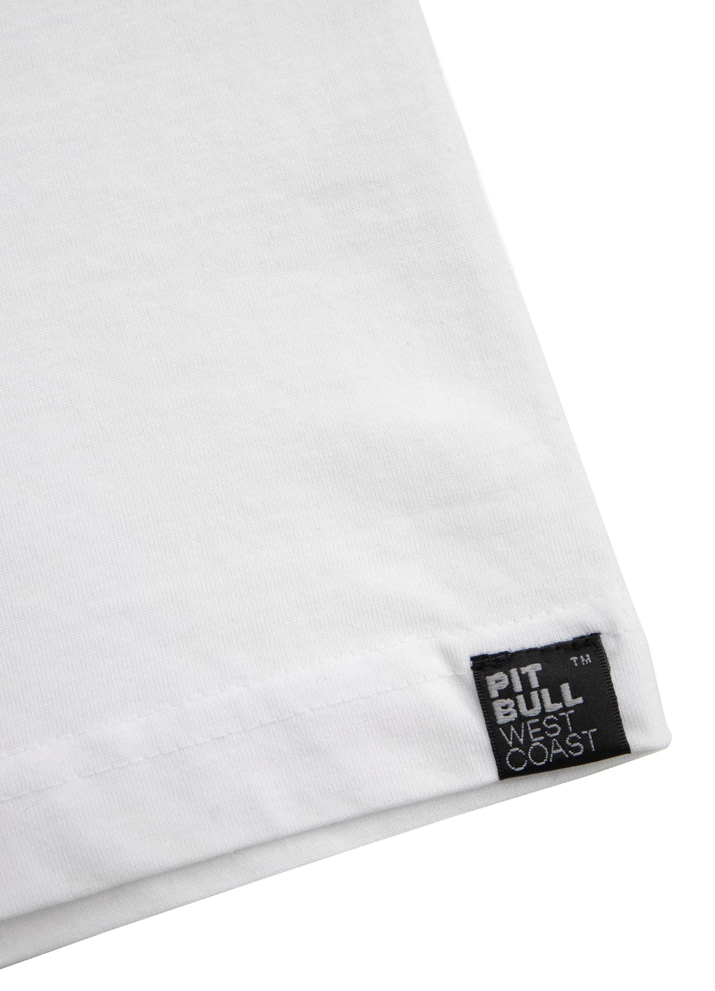 — large woven Pit Bull West Coast logo patch at the hem